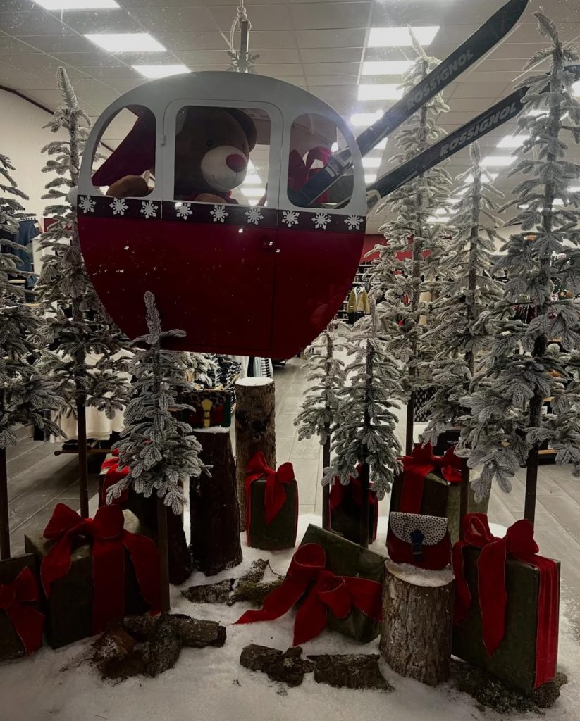 À l’intérieur, un énorme ours en peluche, équipé de son bonnet de Noël et de ses skis, attend sagement le départ pour les pistes. 🐻⛷️